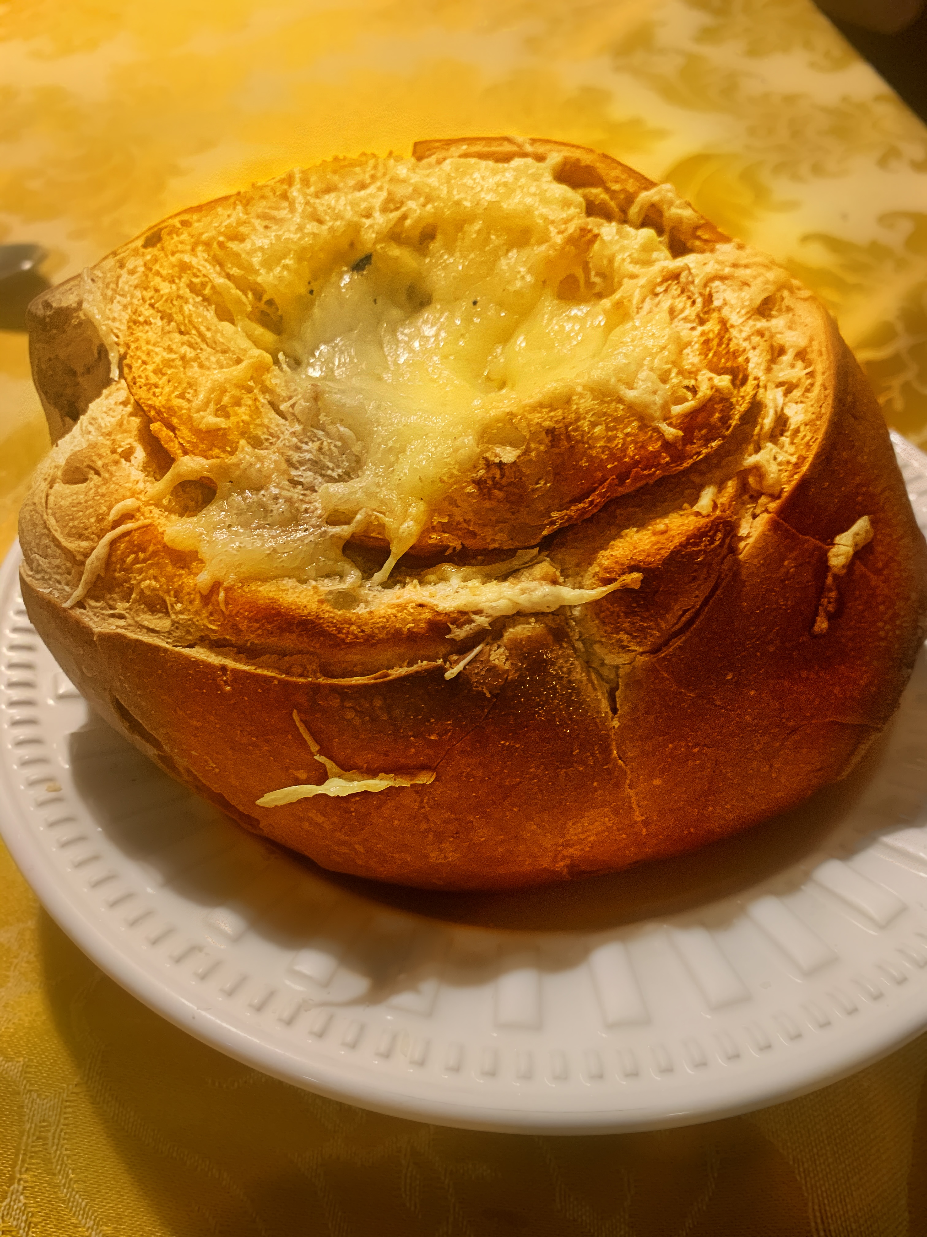 Corte a parte de cima de pão italiano como se fosse uma “tampa” e retire todo o miolo. O pão será a tigela da sopa. Coloque a sopa pronta dentro do pão, rale o queijo por cima em lascas grossas e leve ao forno alto por 5min.